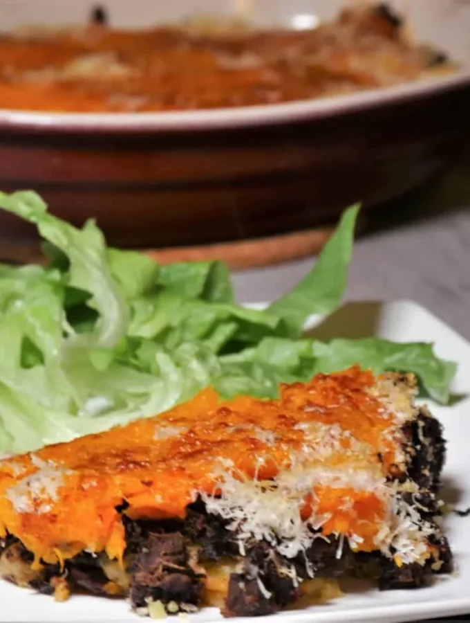 Butternut squash parmentier with blood sausage
