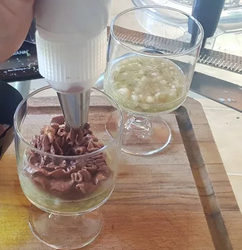 A perfectly crisp hazelnut crumble, a firm dark chocolate mousse, all served on a bed of melt-in-your-mouth banana, infused with lime… These are the flavor experiences this banana-lime, chocolate, and hazelnut verrine promises to deliver!