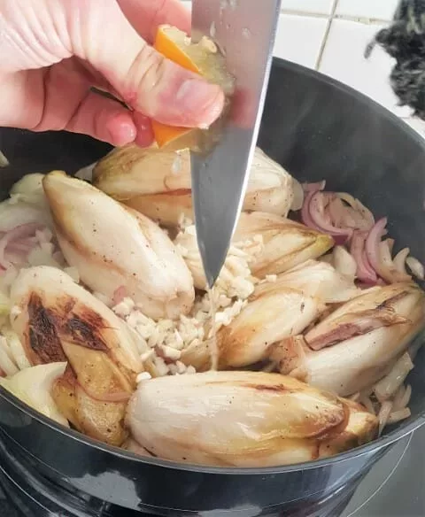 The slow braising process makes them both golden and tender. Plus, the onions, butter, and lemon balance out the bitterness of the endives and give them a delicious touch.