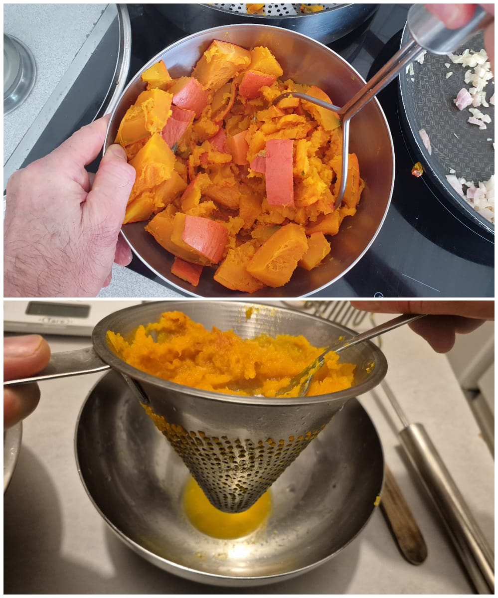 J’ai augmenté le nombre de ramequins à 10. Je préfère ne pas être trop optimiste concernant le nombre de portions. De plus j’ai ajouté une étape de “séchage” de la purée au chinois, j’ai également réduit un peu la crème fraîche et utilisé de la crème fraîche semi-épaisse pour un résultat plus ferme.