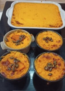 Here’s my version of the butternut squash flan in ramekins with cheese sauce. I discovered this flan in the “Mardi c’est veggie!” section of *Le Monde* newspaper. They had published this recipe, which comes from the book La cucina povera, Laura Zavan, Hachette Cuisine, 240 pages. That’s all for the references!