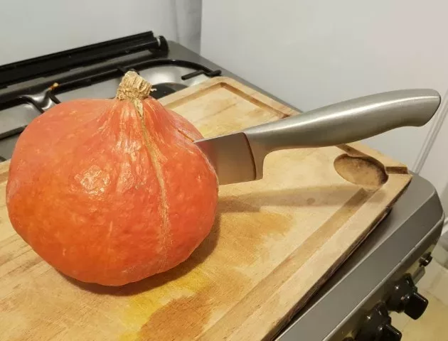 - 2When cutting a butternut squash, be very careful, as you would with any gourd... First, insert your knife near the center, and once it’s firmly in place, slice downward. Then simply turn the squash and repeat the process to cut it in half.