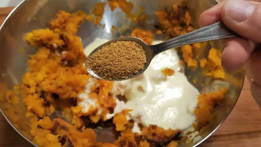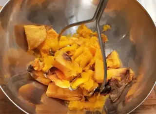 - 6In a mixing bowl, mash the pumpkin flesh into a purée.