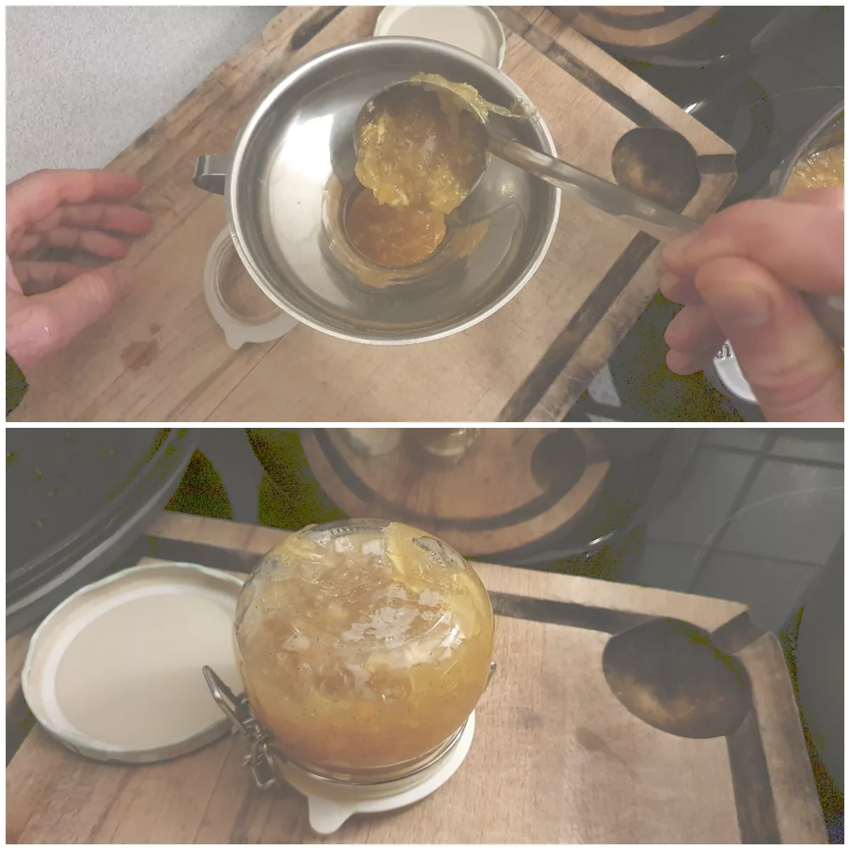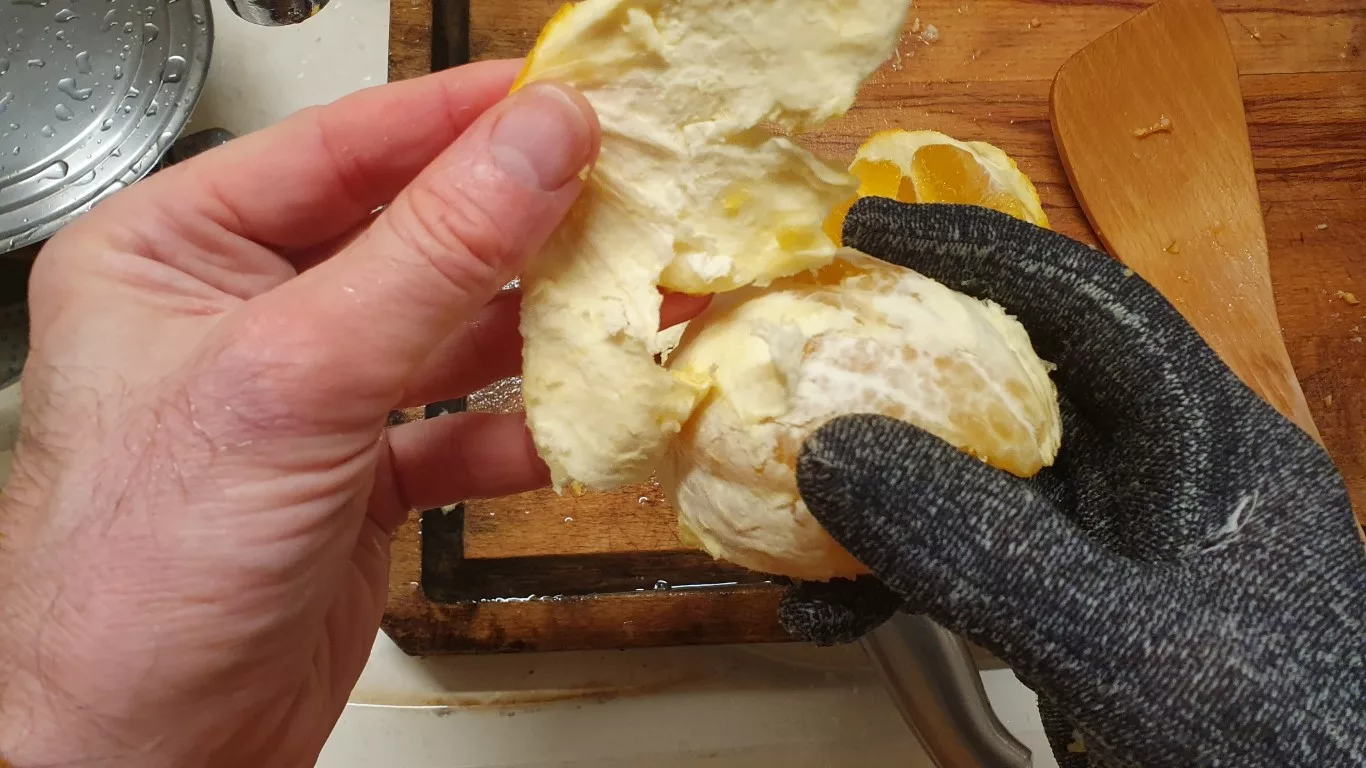 Je voulais retrouver la confiture que me faisait ma mère quand j’étais petit, le résultat est sympa même si pour moi le gout d’agrume est trop prononcé (peut-être à cause des fruits achetés en biocoop, que j’ai trouvé forts et un peu amers) et pourtant je n’ai mis que 4 oranges et 4 citrons pour 5 kg de chaire.