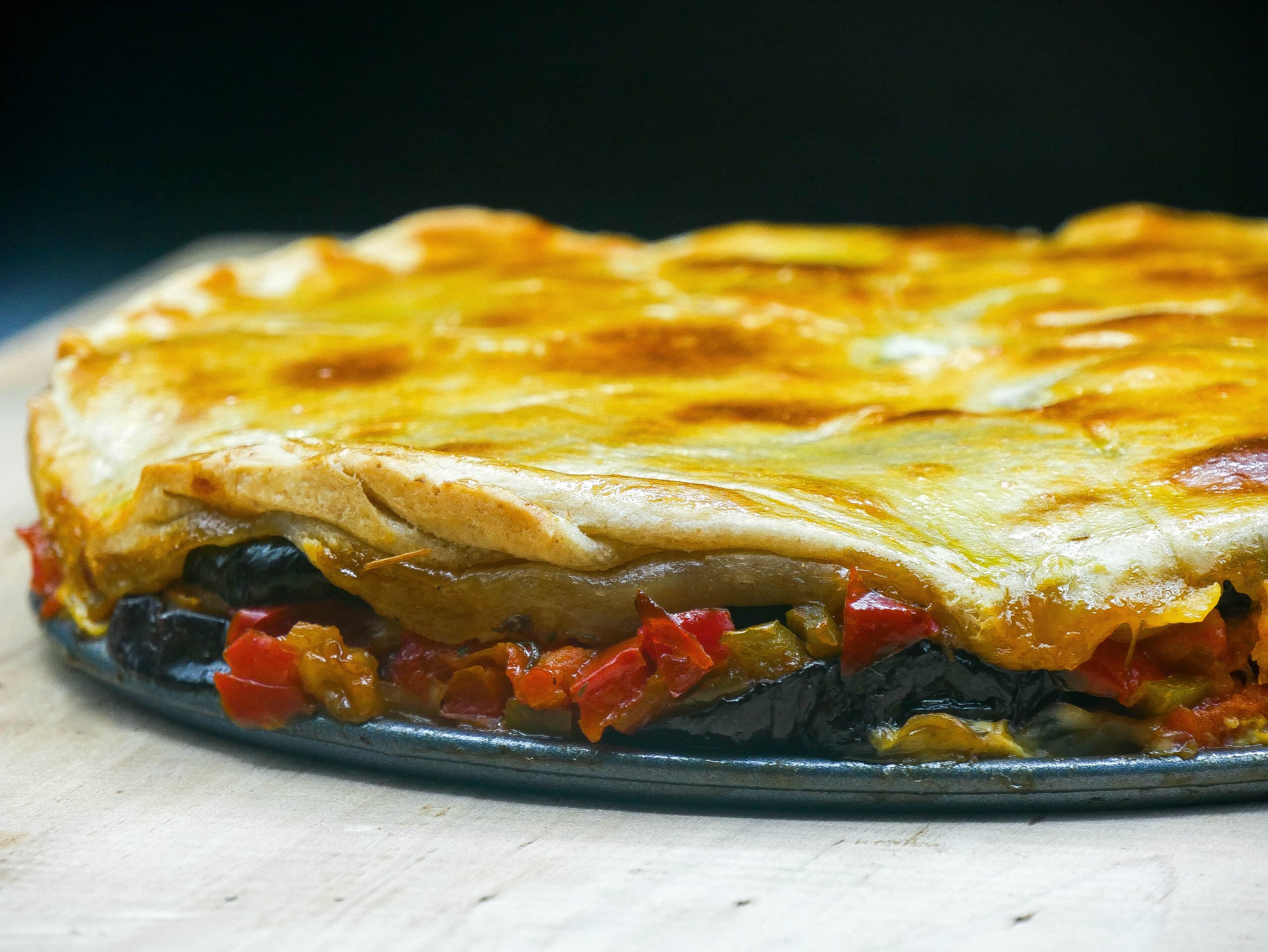 If you don’t have one, a metal tart pan will work too; you’ll see the layer of vegetables underneath the tart once it’s sliced and served on each plate.