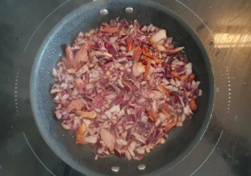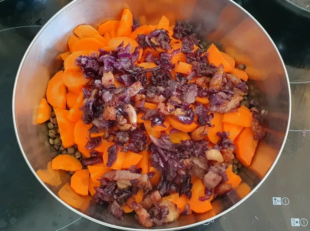 Here’s my recipe for a green lentil and carrot salad, topped with bacon bits, onions, and pickles. It’s my “back-from-the-market” salad—perfect for a quick lunch when you’re really hungry and there’s nothing ready in the fridge!