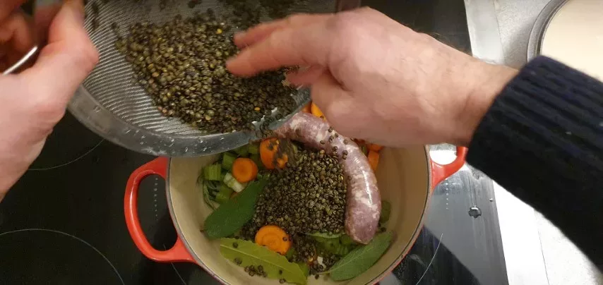 Here is a classic winter recipe, perfect for a hearty, flavorful meal that will keep you warm. These lentils and Toulouse sausages have been slowly simmered in a vegetable and herb broth.