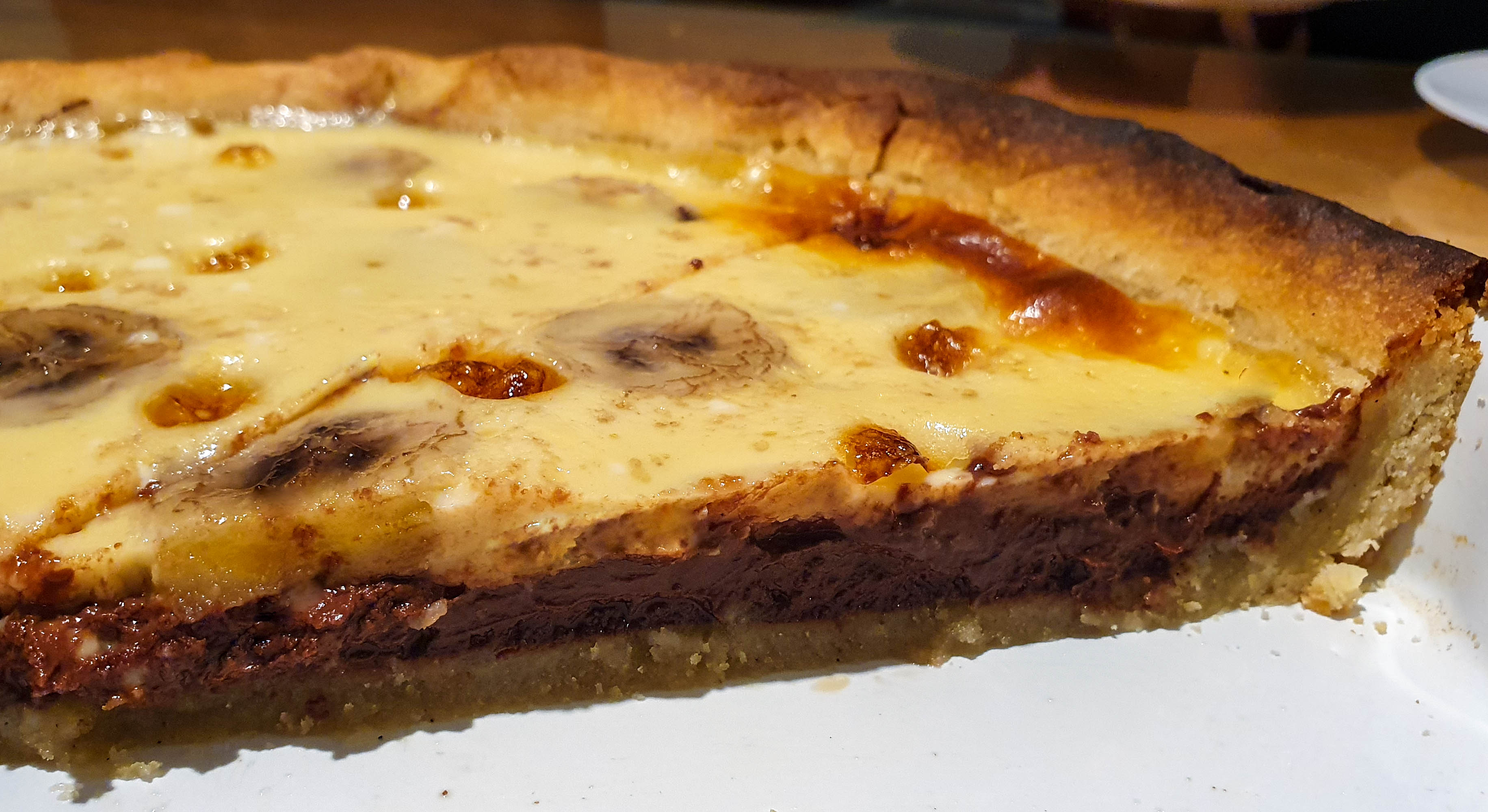 - First, there’s the “chocolate++” version, with a thick layer of ganache and banana slices on top,