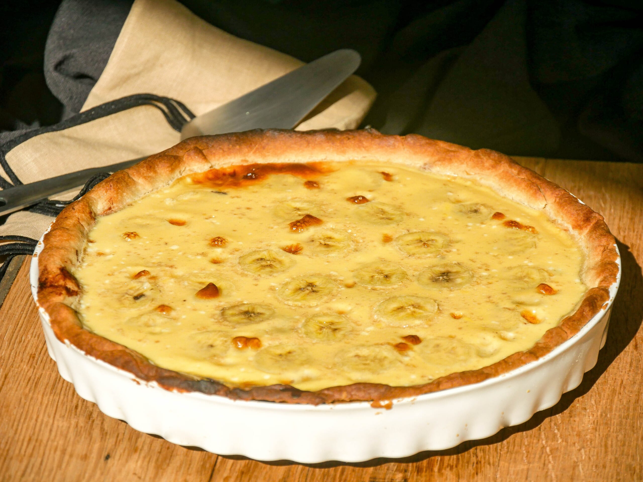 Sweet tooths will be in heaven with this chocolate-banana tart made with a shortcrust pastry base and topped with dark chocolate ganache. We then finish it off with banana slices and a topping made with milk, eggs, and brown sugar. It’s this egg mixture that will brown and caramelize in the oven, while protecting the banana slices.