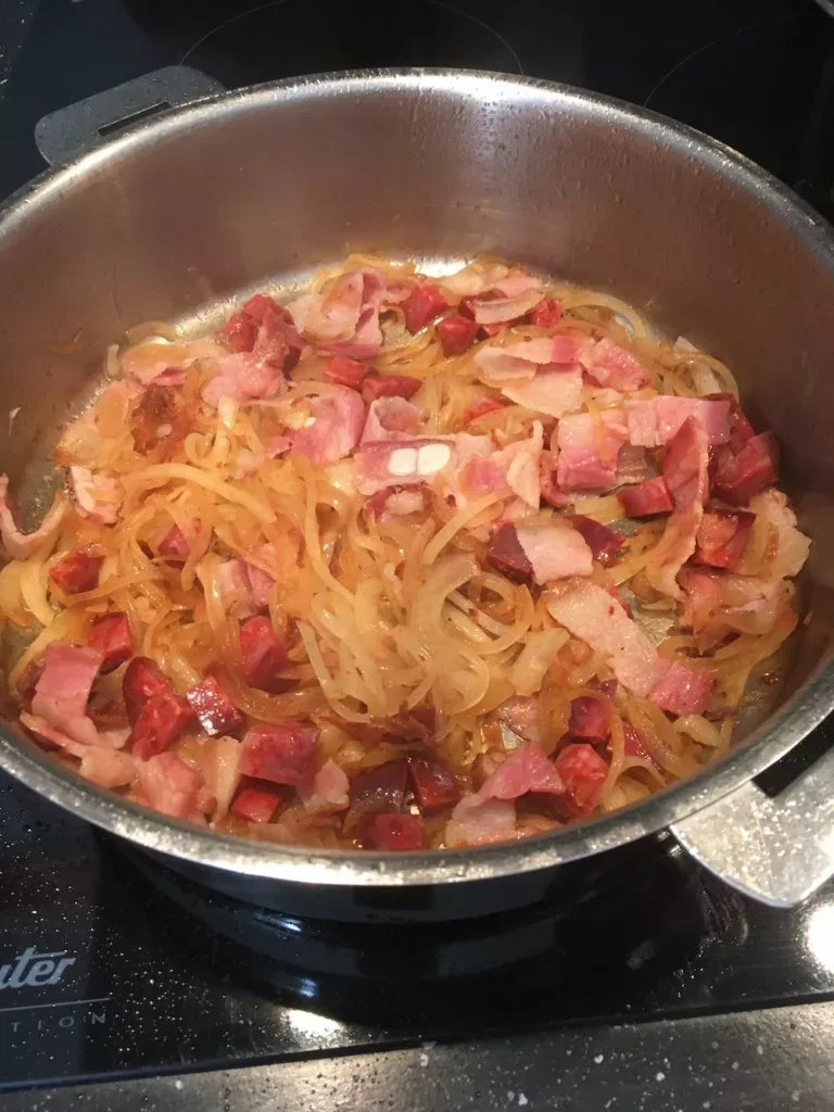 A simple pork stir-fry with onions, smoked bacon, and chorizo.