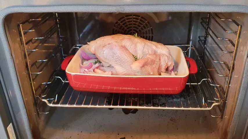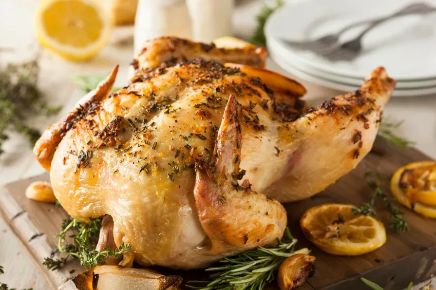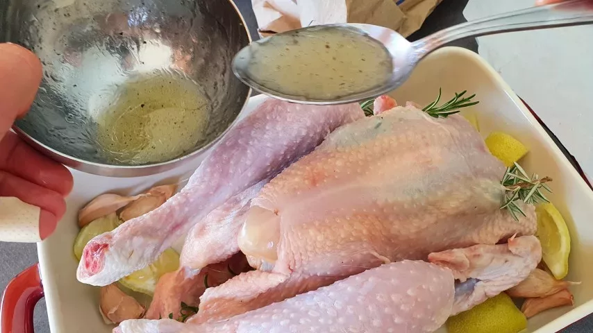 The chicken comes out of the oven tender and full of flavor from the aromatic herbs, lemon juice, and garlic.