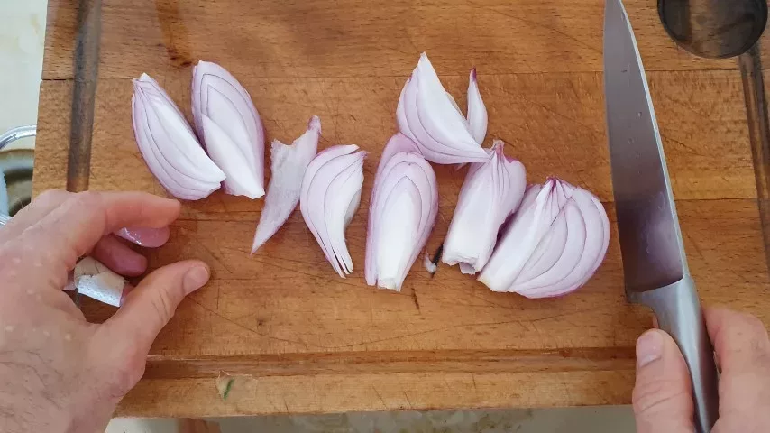 To top it all off, the remaining lemon, along with the onion and unpeeled garlic cloves, have slowly caramelized in the juices and fat around the chicken.