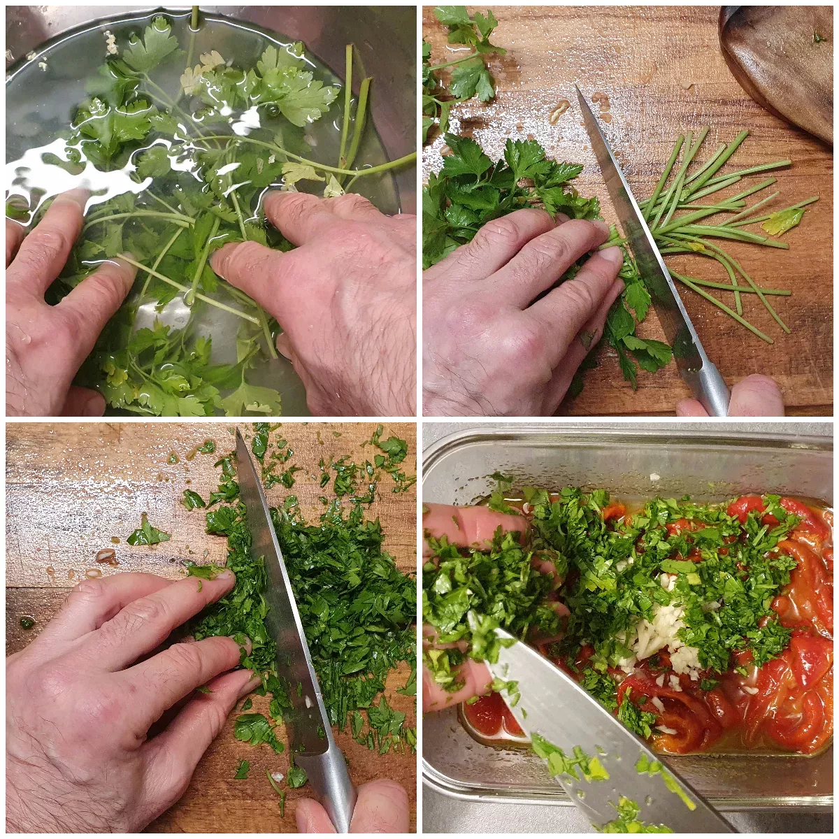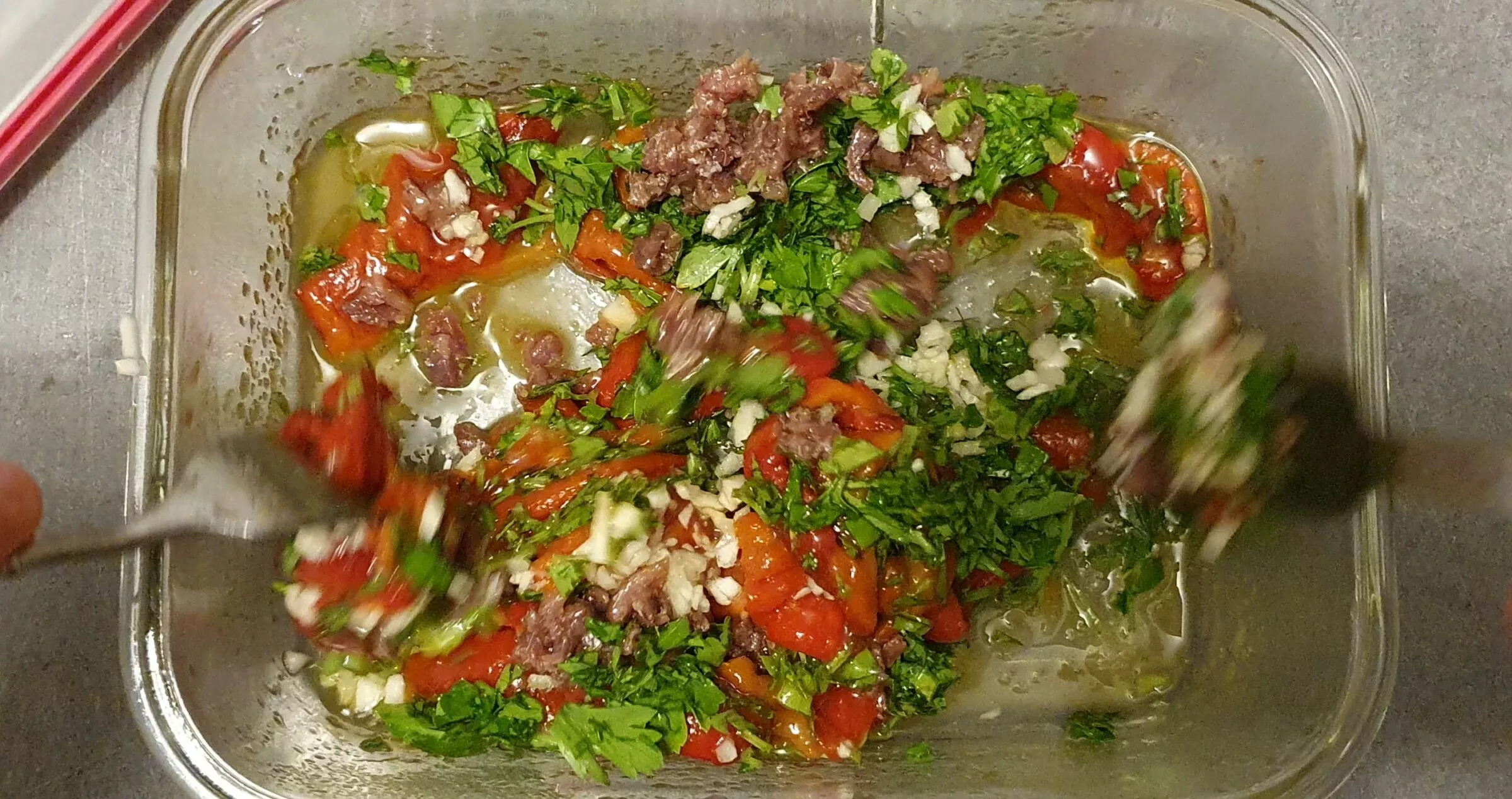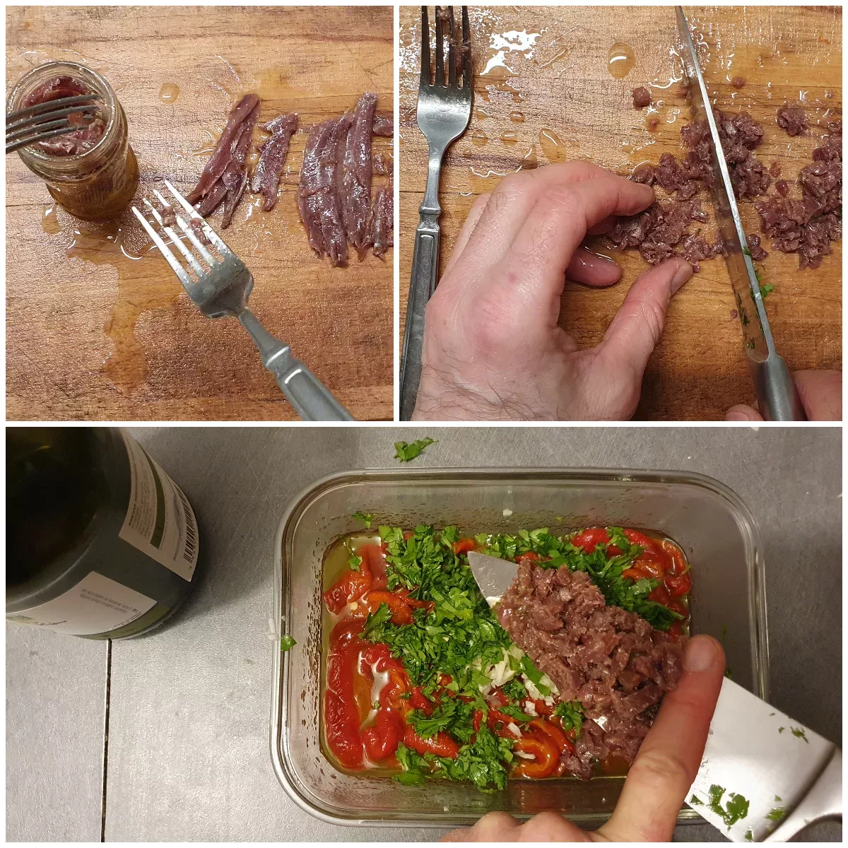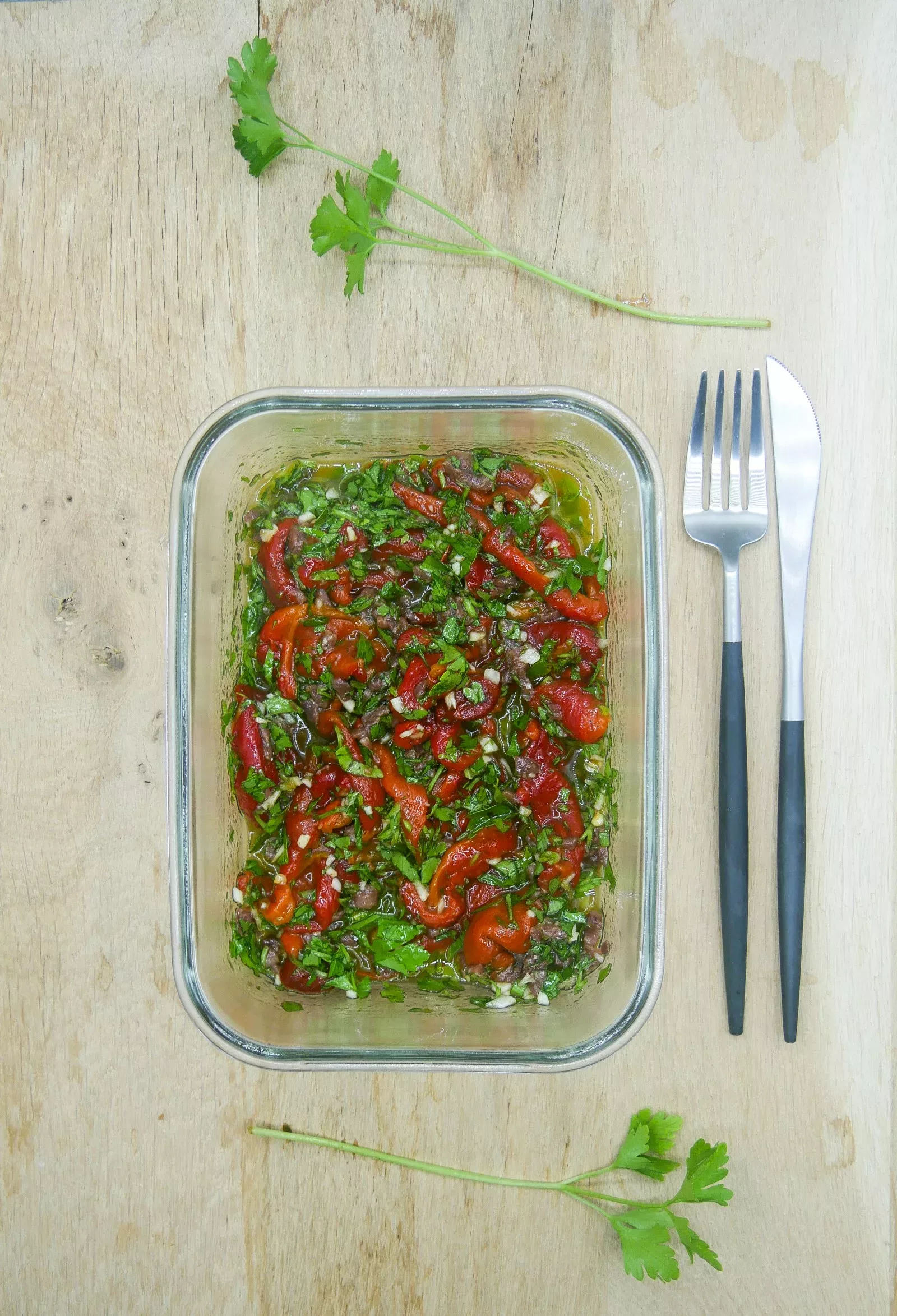 These roasted peppers, preserved in a marinade made with olive oil, garlic, anchovies, and herbs, are incredibly fragrant. It’s actually hard to stop eating them once you start, and we love “mopping up” the oil left at the bottom of the plate!