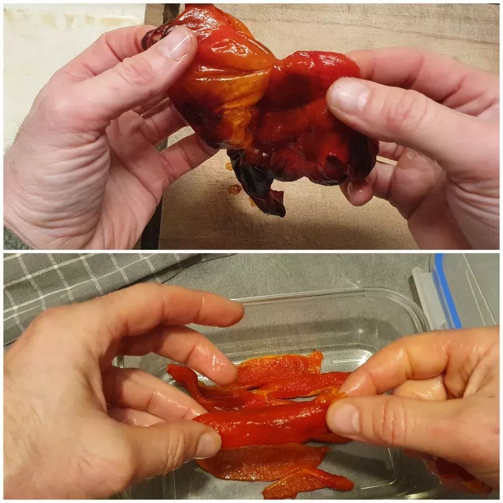 They can be served as an appetizer, but also as a “mezze” for a Mediterranean-inspired meal. Preparation is easy, and it can be done in two steps if you don’t have time to cook the peppers right after grilling them.