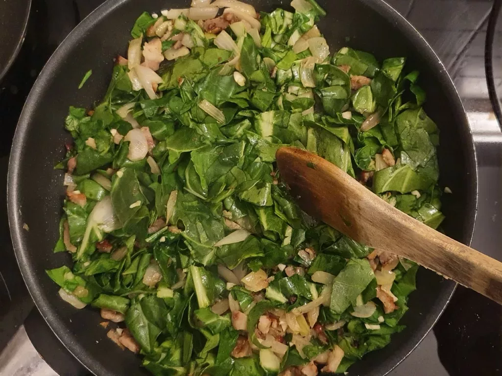 In this recipe, I prepare a delicious filling made with Swiss chard leaves, bacon, garlic, and cheese—and it’s a real treat!