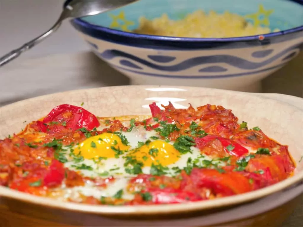 In the Maghreb countries, it’s a true traditional dish. It’s served in restaurants or at home, in a cast-iron skillet, with bread to soak up the sauce. It is also served with other dishes, such as grilled eggplant and hummus.