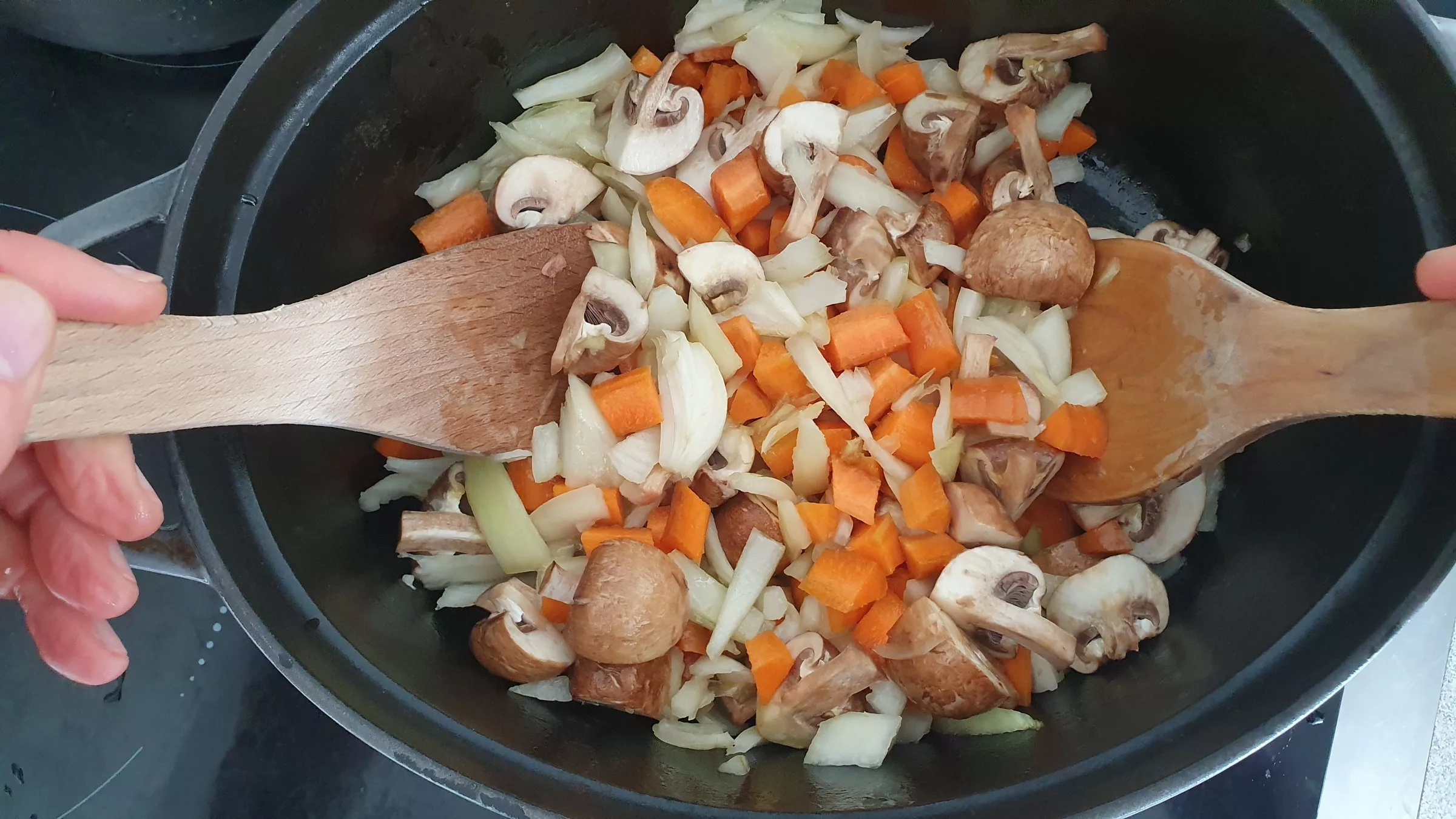 But instead of meat, this recipe highlights vegetables: mushrooms, carrots, and onions come together to create a delicious stew on their own.